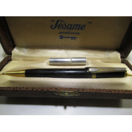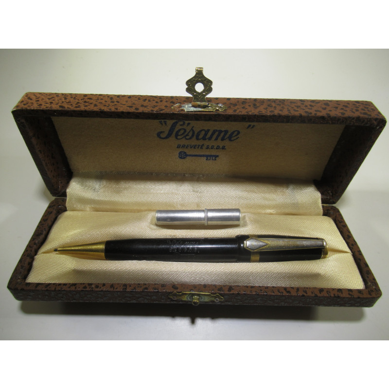 Porte-mine SESAME en résine noire, fabriqué en France à Saint Claude dans le Jura au milieu du 20ème siècle, longueur : 107 mm, fonctionnement à poussoir parfait, livré avec étui de mines 1.2mm (plus à votre demande), excellent état général, dans son coffret d’origine, pour collection ou pour écrire.