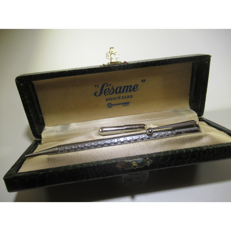 Porte-mine SESAME, fabriqué en France à Saint Claude dans le Jura au milieu du 20ème siècle, marquage sur le capuchon « SATURNE SESAME – Bté S.G.D.G. », neuf et n’ayant jamais été utilisé, longueur : 109 mm, mines : 1.2 mm, fonctionnement parfait, livré avec étui de mines, excellent état général, dans son coffret d’origine, pour collection ou pour écrire.