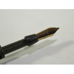 Petit stylo plume safety français sans marque, en ébonite noire, jamais utilisé, mécanisme fonctionnel, plume or « WARRANTED – 18 CTS ». Longueur fermé 107 mm, diamètre capuchon 9 mm, livré avec une jolie petite agrafe, excellent état général, pour collection. Sans garantie pour être utilisé.