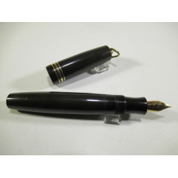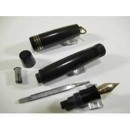 Petit stylo plume en ébonite noire, ( 92 mm capuchon fermé, diamètre du corps 11.5 mm ), sans marque apparente mais ressemble à s’y méprendre à un PARKER VEST POCKET, plume or 18K « WARRANTED 18CT 1st QUALITY », système remplissage par bouton poussoir, sac absent, bon état général, sans garantie pour être utilisé, pour collection.
