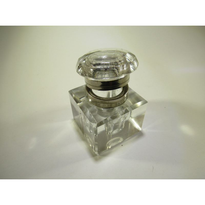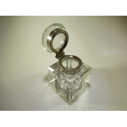 Encrier en cristal carré, fabrication inconnue. Avec un couvercle à bascule en cristal. Très bon état général.