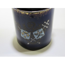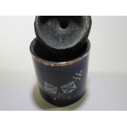 Petit encrier en faïence, fabrication française de forme ronde. Décoré avec les armoiries de "Jeanne D’ARC". Couvercle en métal. En très bon état.