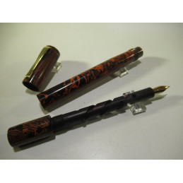 Stylo plume rentrante sans marque apparente, probablement de fabrication française, en ébonite rouge et noire, mécanisme fonctionnel, plume or « WARRANTED - 18 CTS – 1ère QUALITE », longueur fermé 113 mm, diamètre capuchon 12.5 mm. Très bon état général, pour collection. Sans garantie pour être utilisé.