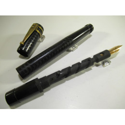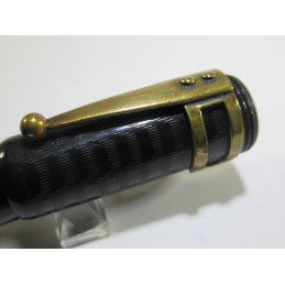 Stylo plume safety GOLD STARRY, plume or « GOLD STARRY - * - 18 CARATS – 5 », en ébonite noire, marquage sur le corps « MANUFACTURE FRANCAISE - GOLD STARRY – MARQUE DEPOSEE – N° 258 », jamais utilisé, mécanisme en parfait état, excellent état général, livré avec une agrafe en laiton. Pour collection, non testé donc sans garantie pour écrire.