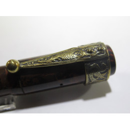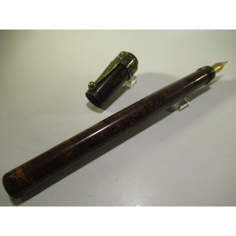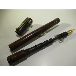 Stylo plume MATADOR, longueur 126.5mm fermé, diamètre capuchon 13mm, en ébonite rouge et noire, plume or « WARRANTED – 14K – 4 », système rotatif en état de marche, nettoyé et très bon état général, inscription sur le corps « MATADOR SAFETY » et sur le bout « 41 ». Livré avec une agrafe en bronze motif DRAGON. Pour collection, sans garantie pour être utilisé. Attention si vous achetez ce stylo, pour le démonter le pas de vis est à gauche.
