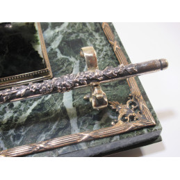 Encrier en bronze sur marbre vert, fabrication française inconnue du 19ème siècle. Livré avec un beau porte-plume plaqué argent. Bon état général.