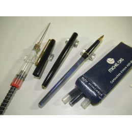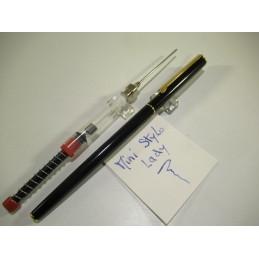 Mini stylo plume LADY sans marque apparente, longueur fermé 121 mm, diamètre 6.5 mm, en laiton laqué noir, plume acier plaquée or M, remplissage par cartouche fournie et avec une seringue de remplissage. Une boite de cartouches est livrée avec le stylo. Fonctionnement parfait, voir essai d’écriture. Bon état général, pour collection ou pour écrire.