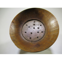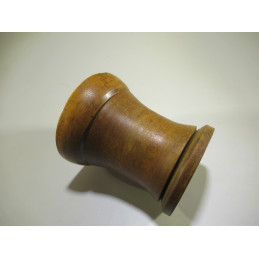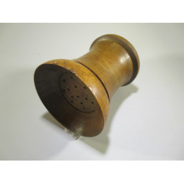 Saupoudreuse de fabrication française en buis. Cet objet était utilisé pour sécher l’encre après l’écriture comme le ferait un buvard. Le dessus ne se démonte pas et le remplissage s’effectue en mettant la poudre dans la partie supérieure conique puis en la faisant passer dans les petits trous. Ce réceptacle conique permet également de récupérer la poudre en excédent sur le papier. Hauteur : 72mm, diamètre au plus large : 65mm.