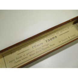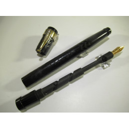 Stylo plume rentrante marque TACOS SAFETY, en ébonite noire, mécanisme fonctionnel, plume or « WARRANTED – 18 Cts – 1st QUALITY », marquage sur le corps « TACOS », longueur fermé 131 mm, diamètre capuchon 14 mm, avec une bague type « IDEAL », très bon état général. Livré avec son coffret d’origine ainsi que sa notice d’utilisation. Pour collection. Sans garantie pour être utilisé.