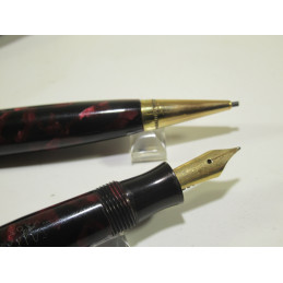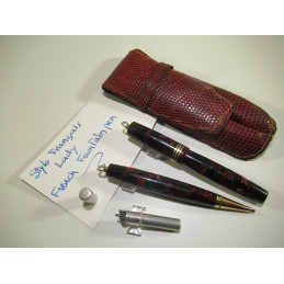 Etui cuir comprenant un stylo plume et un porte-mine marque TRUST, fabrication française, système de remplissage à poussoir fonctionnel, sac dans le stylo, plume or M « WARRANTED – 18 Cts – 1ère QUALITE », porte mine fonctionnel. Livré avec son étui cuir en très bon état ainsi que la notice d’origine (en mauvais état) et une réserve de mine 1.2mm. Longueur du stylo plume : 100 mm, longueur du porte-mine : 90 mm. Très bon état général, pour collection ou pour écrire.