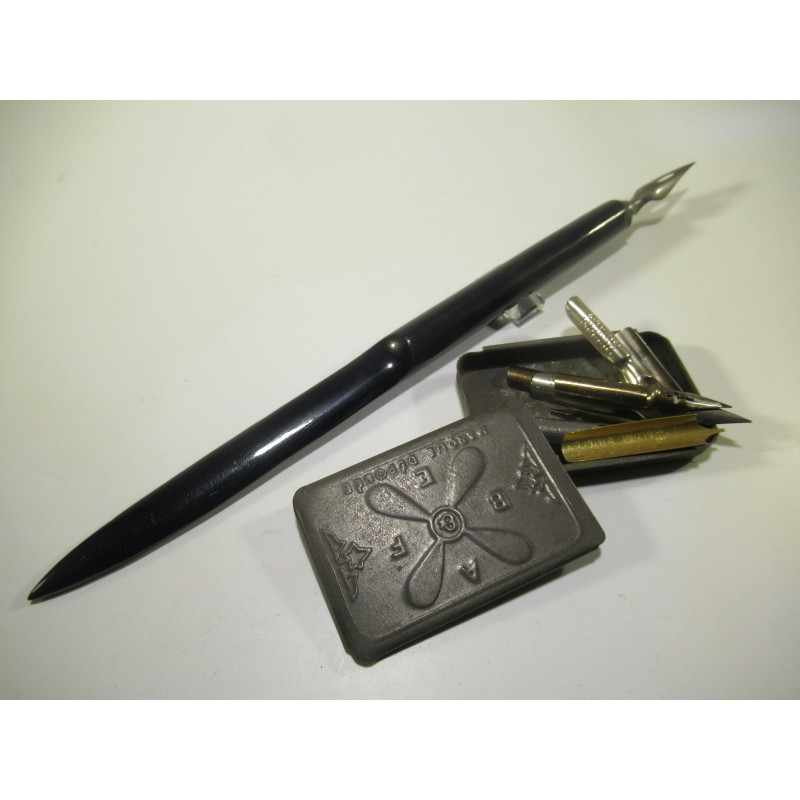 Porte-plume combiné ouvre-lettre en galalithe. La galalithe (« pierre de lait », du grec ancien gála, « lait », et / líthos, « pierre ») est un polymère thermodurcissable issu de la caséine et une des premières matières plastiques avec l’ébonite utilisées pour la fabrication d’objets d’écriture au début du 20ème siècle. En bon état. Livré avec 1 boite de plumes assorties. Pour apprendre à écrire à la plume.