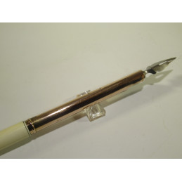 Porte-plume en galalithe et cuivre. La galalithe (« pierre de lait », du grec ancien gála, « lait », et / líthos, « pierre ») est un polymère thermodurcissable issu de la caséine et une des premières matières plastiques avec l’ébonite utilisées pour la fabrication d’objets d’écriture au début du 20ème siècle. En bon état. Livré avec 1 boite de plumes assorties. Longueur sans la plume 145 mm. Pour apprendre à écrire à la plume.