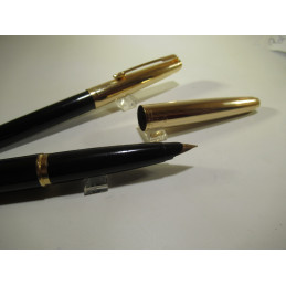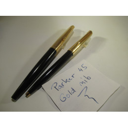 Parure stylo plume + stylo à bille PARKER 45, plume or 18K, system de remplissage par cartouche fournie qui fonctionne, la cartouche du stylo à bille est neuve, peu ou pas utilisés, excellent état général. Marquage sur la base du capuchon « DOUBLE OR LAMINE – MADE IN FRANCE – PARKER ». Dans son étui d’origine avec sa notice. Pour collection ou pour écrire.