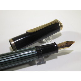 Stylo plume PELIKAN, système de remplissage à piston fonctionnel, plume or « PELIKAN – 18 KARAT – GERMANY – M », marquage sur la bague « PELIKAN 400 », longueur avec le capuchon 126mm, diamètre du capuchon 13mm, très bon état général pour collection ou pour écrire. Testé et fonctionnel.
