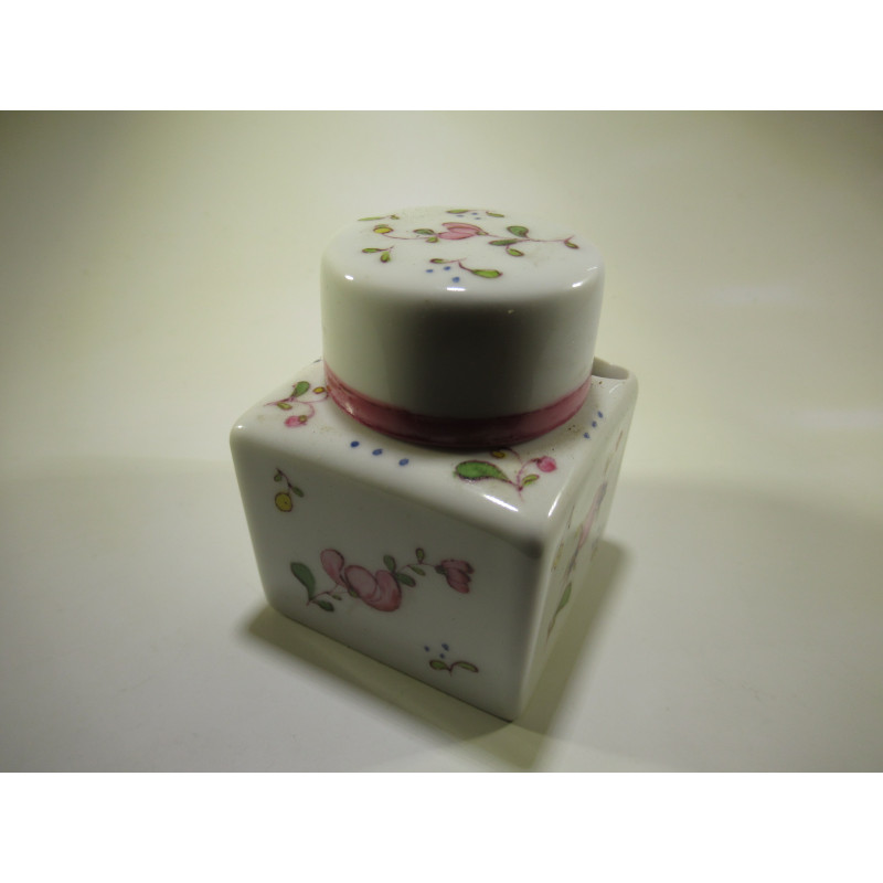 Mignon petit encrier en porcelaine, fabrication française de LIMOGES. Marquage sous l’encrier « COQUET Limoges France – Peint à la main ». Excellent état.