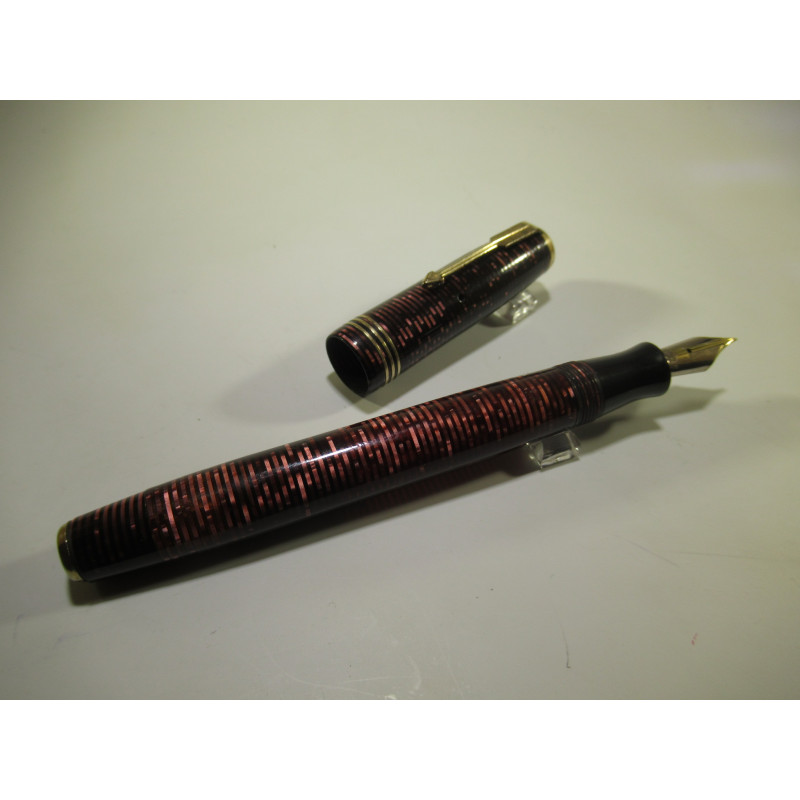 Stylo plume PARKER vacumatic, longueur fermé 130 mm, diamètre capuchon 13.5 mm, en celluloïd rose strié, plume or « 18K - PARKER – VACUMATIC – REG T.M. », system de remplissage vacumatic qui fonctionne, le sac est absent, inscription sur le corps « MADE IN CANADA - PARKER VACUMATIC – PAT NO. 318982 36- IMPORTE DU CANADA ». Très bon état général, pour collection, sans garantie pour utilisation.