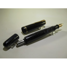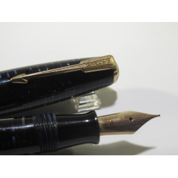 Stylo plume PARKER VACUMATIC, longueur fermé 128 mm, diamètre capuchon 14 mm, en celluloïd bleu strié, plume or « PARKER – USA », system de remplissage VACUMATIC qui fonctionne, le sac est probablement à remplacer, inscription sur le corps « GEOS PARKER - PARKER VACUMATIC – MADE IN USA ». Très bon état général, pour collection, sans garantie pour utilisation.