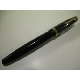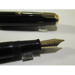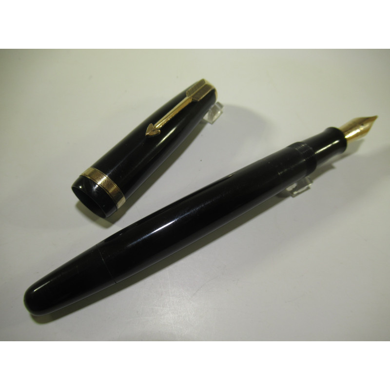 Stylo plume PARKER DUOFOLD, couleur noir, plume or « PARKER DUOFOLD 14 K PEN N », système de remplissage par poussoir qui fonctionne, sac absent, sur le corps est gravé « GEO.S PARKER - PARKER DUOFOLD – REG. T. M. », longueur capuchon fermé : 131 mm, diamètre capuchon 13.5 mm, très bon état général, pour collection.