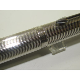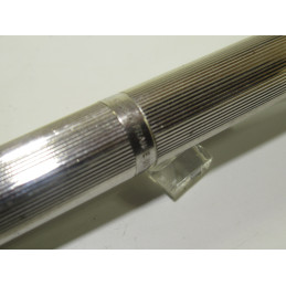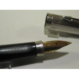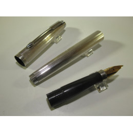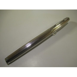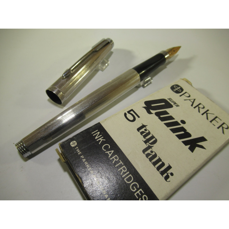 Stylo plume PARKER 75, couleur argent strié, plume or « PARKER 18K France » M, système de remplissage à cartouche, marqué sur la base du capuchon « PARKER – MADE IN FRANCE UC », très bon état général. Livré avec une boite de cartouches. Pour collection ou pour écrire. Si vous souhaitez l’utiliser demandez-moi de le mettre en service avant de vous l’expédier.