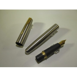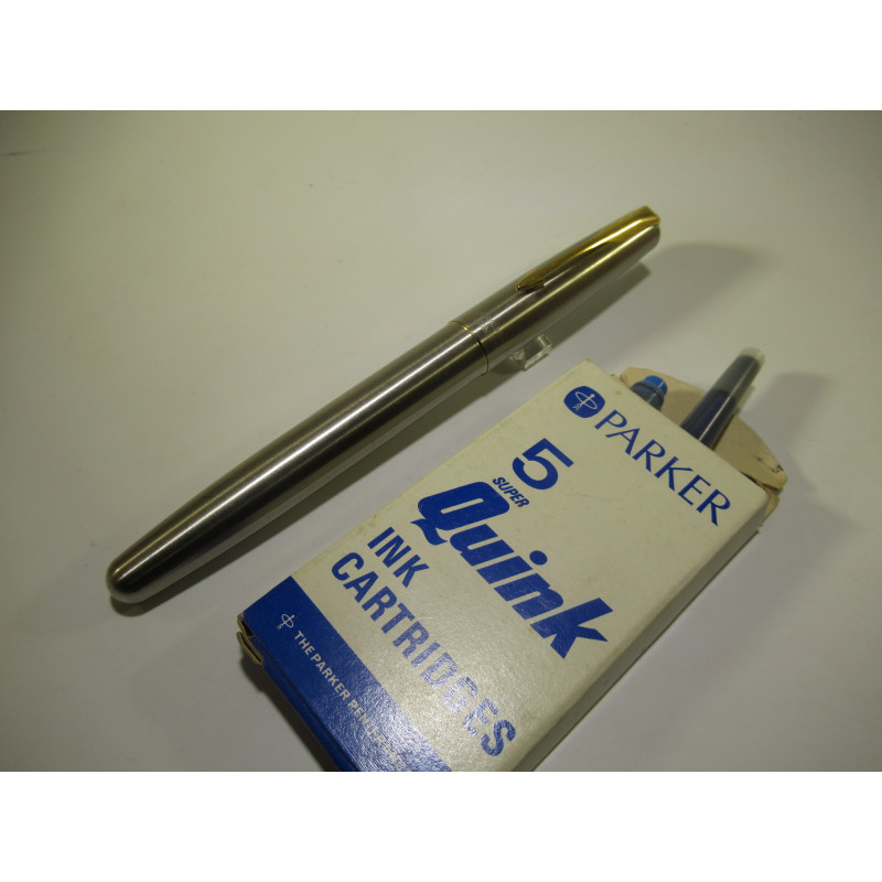 Stylo plume PARKER FRONTIER en inox brossé, marqué sur la base du capuchon « PARKER – FRONTIER - MADE IN UK – A1 », plume acier plaquée or « PARKER ». Livré avec une boite de cartouches. Jamais utilisé, très bon état général, pour collection ou pour écrire. Si vous souhaitez l’utiliser demandez-moi de le mettre en service.