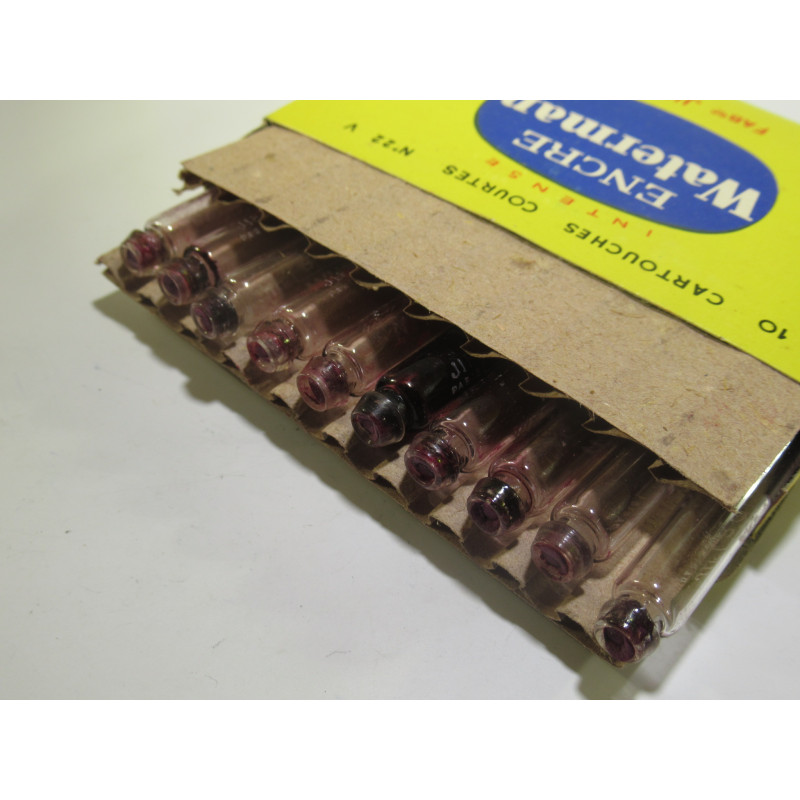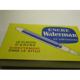 Boite complète de 10 cartouches courtes WATERMAN pour stylos plume WATERMAN lady. Les cartouches bien que non utilisées sont vides, l’encre s’est évaporée avec le temps. La fabrication et la commercialisation de ces cartouches a cessé le 31 décembre 1970. Vous pouvez remplir ces cartouches avec la seringue spéciale en vente sur ce site dans la rubrique « divers objets d’écriture ».