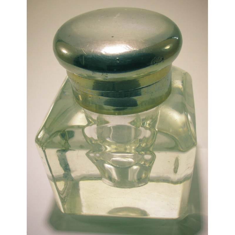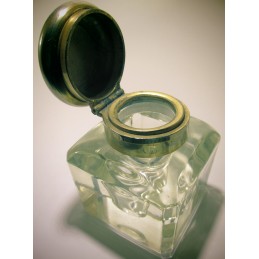 Encrier en cristal carré, fabrication inconnue. Quelques traces d’usage mais bon état général.