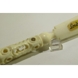 Porte-plume à vue en os à l’effigie de LOURDES. Quand vous regardez dans la petite lentille qui se trouve dans la partie sphérique centrale du le porte-plume vous pourrez admirer un dessin du Christ. En bon état. Livré avec 3 plumes. Pour apprendre à écrire à la plume ou pour collectionner.