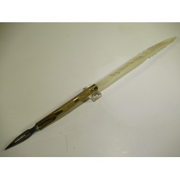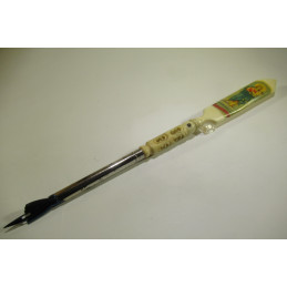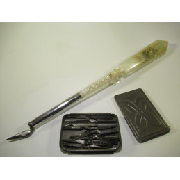 Porte-plume à vue en os à l’effigie de MARSEILLE. Quand vous regardez dans la petite lentille qui se trouve dans la partie sphérique centrale du le porte-plume vous pourrez admirer un dessin de Notre Dame des Victoires. En bon état. Livré avec 3 plumes. Pour apprendre à écrire à la plume ou pour collectionner.