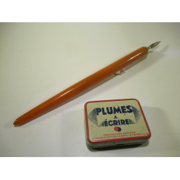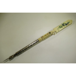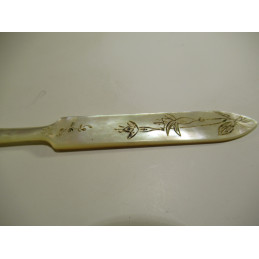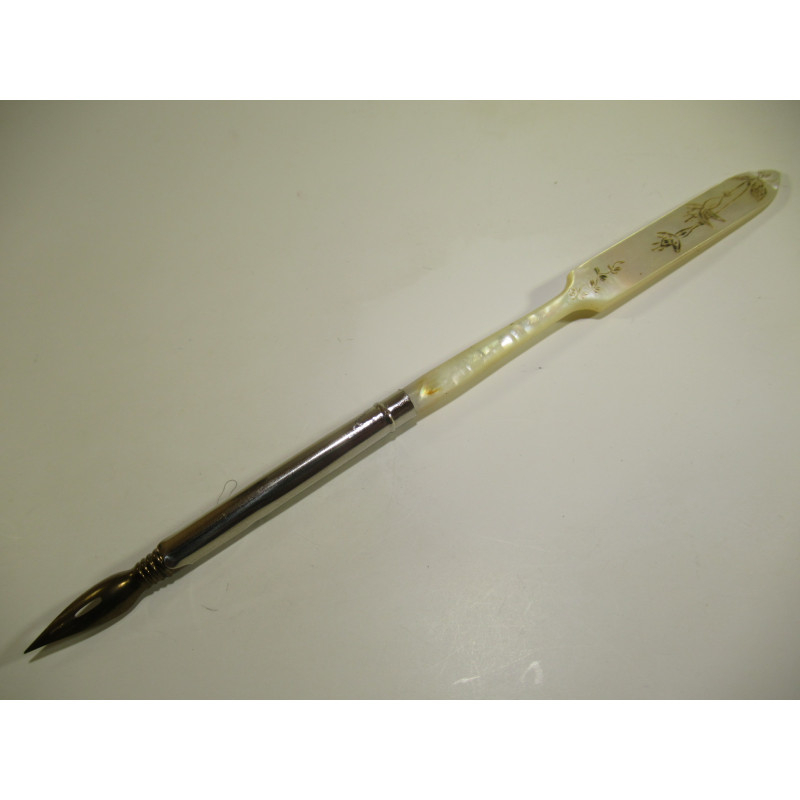 Porte-plume en nacre naturelle. Décor floral. En très bon état. Livré avec quelques plumes. Pour apprendre à écrire à la plume ou pour collectionner. Longueur : 155 mm.