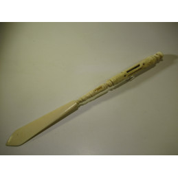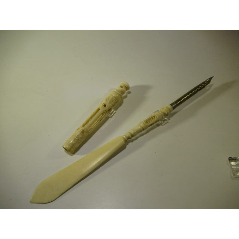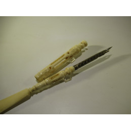 Porte-plume de voyage en os. Travail artisanal. Il se démonte en deux parties permettant de mettre la plume à l'abri pour le transport. Longueur : 215mm. En bon état. Livré avec 3 plumes assorties. Pour apprendre à écrire avec un porte-plume ou pour collectionner.