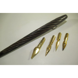 Porte-plume en bois sculpté. Livré avec 4 plumes plaquées or dans son étui d'origine. Très bon état. Pour apprendre à écrire à la plume ou pour collectionner.