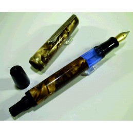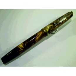 Stylo plume probablement allemand, marquage sur le corps « Le Frevire », en celluloïd marron et or, longueur capuchon fermé 126 mm, diamètre du capuchon 13 mm, plume acier « 14 CT GOLD PLATED », system de remplissage à piston fonctionnel, jamais utilisé, bon état général, sans garantie pour écrire, pour collection.