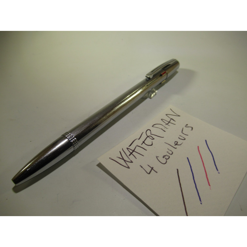 Stylo bille 4 couleurs WATERMAN, chromé brillant, marquage sur le clip « WATERMAN », fonctionnement parfait, les cartouches sont présentes et fonctionnelles, bon état général, pour collection ou pour écrire.