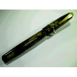 Stylo plume français, en celluloïd vert et noir, plume or « WARRANTED – 18 CT – 1st QUALITY », système de remplissage à levier, sac absent, pour collection. Sans garantie pour utilisation.