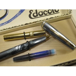 Stylo plume plaquée or, marbré vert, marque « EDACOTO », années 60, système de remplissage à cartouche (1 vide est fournie avec le stylo – la marque de ces cartouches est « BUS » et n’est plus commercialisée. Neuf jamais utilisé (les marquages commerciaux sont encore présents, voir photo), très bon état général, livré dans son coffret d’origine. Pour collection, aucune garantie pour utilisation.