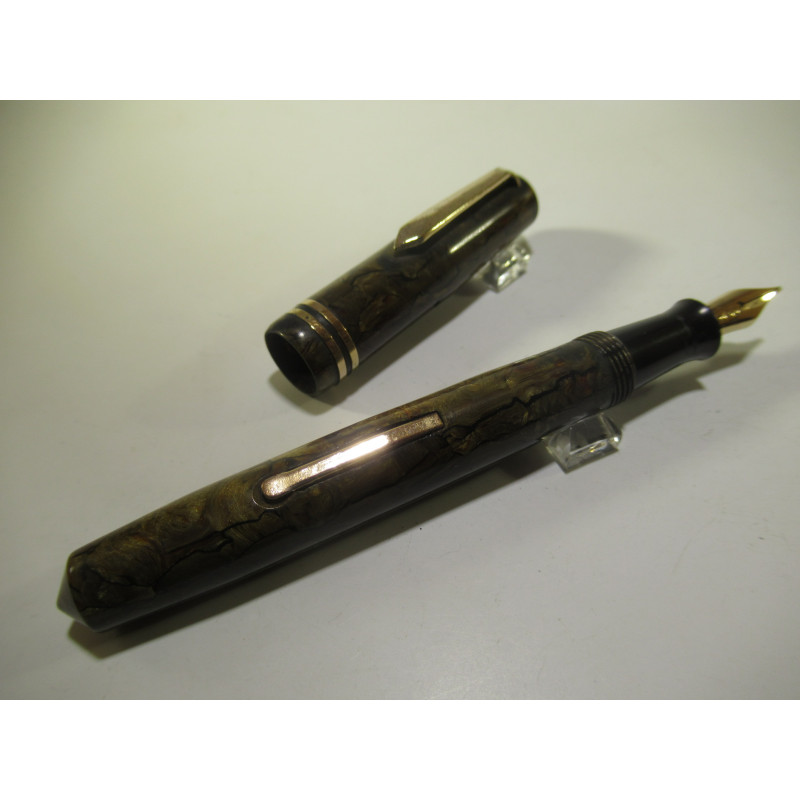 Stylo plume LADY BAYARD, en celluloïd marron et beige, plume or « PF - 18 Ct - 35 ». PF veut dire PANICI FRERES, voir le site : https://bayard-sans-reproche.com/premiere-collection-made-in-france/