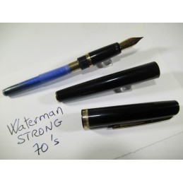 Stylo plume WATERMAN STRONG à cartouche, plume or « WATERMAN – SUPER – 6 – 18 Carats », résine couleur noir, longueur avec capuchon 141mm, diamètre du corps 12.5mm. Livré avec 3 cartouches. Excellent état général, pour collection ou pour écrire.
