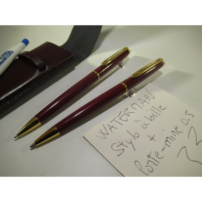 Parure stylo à bille et porte-mine WATERMAN HEMISPHERE, laqués rouge bordeaux et clip plaqué or, mécanismes rotatifs fonctionnel, mines 0.5 mm fournies, recharge bille fonctionnelle, peu ou pas utilisés, excellent état. Livré avec un très bel étui en cuir. Longueur des stylos : 132 mm. Pour collection ou pour écrire.