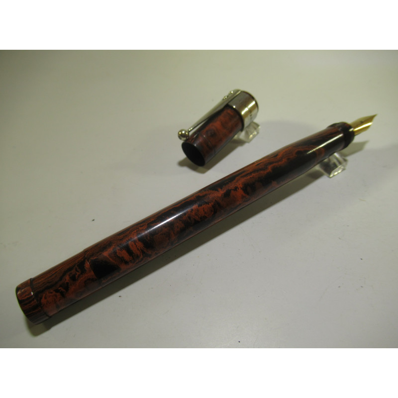 Stylo plume safety français marque ZODIAC, en ébonite rouge et noire, fabriqué par la société LA PLUME D’OR qui fabriqua aussi sous la célèbre marque METEORE. Mécanisme fonctionnel, plume or « WARRANTED - 18 Cts – 1ère QUALITE ». Marquage sur le corps « ZODIAC – UNIS France » et « S 2 », longueur fermé 114 mm, diamètre capuchon 11.5 mm. Livré avec une belle agrafe » ARGENTAN – JL PARIS ». Très bon état général, pour collection. Sans garantie pour être utilisé.