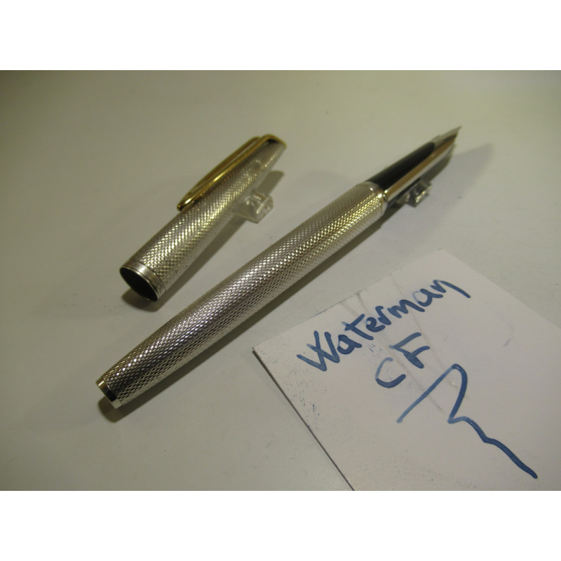 Stylo plume WATERMAN CF en argent massif, décor « GRAIN D’ORGE », plume or « 18 K - 750 », livré avec un convertisseur, marquage sur la base du capuchon : « WATERMAN C/F – ARGENT MASSIF ». Un petit choc sur le capuchon (voir photo) sinon en bon état général. Le prix tient compte de ce petit défaut. Testé et fonctionnel. Pour collection, ou pour écrire.