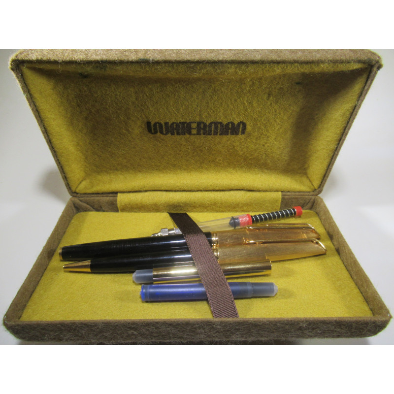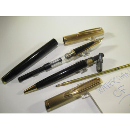 Parure stylo plume et bille WATERMAN CF, plume or « 18 K - 750 », noir et capuchon plaqué or, 2 cartouches fournies ainsi qu’un convertisseur, dans le coffret d’origine avec étui pour cartouche, semble n’avoir jamais été utilisé, très bon état général (voir photos). Les cartouches pour ce stylo ne sont plus commercialisées, c’est pourquoi je fourni une seringue de remplissage de la cartouche. Si vous retirez le convertisseur pour utiliser une cartouche il faut retirer le joint de couleur bleu d’adaptation entre le convertisseur et la section. La recharge du stylo bille est fonctionnelle et je peux en fournir des neuves si besoin.