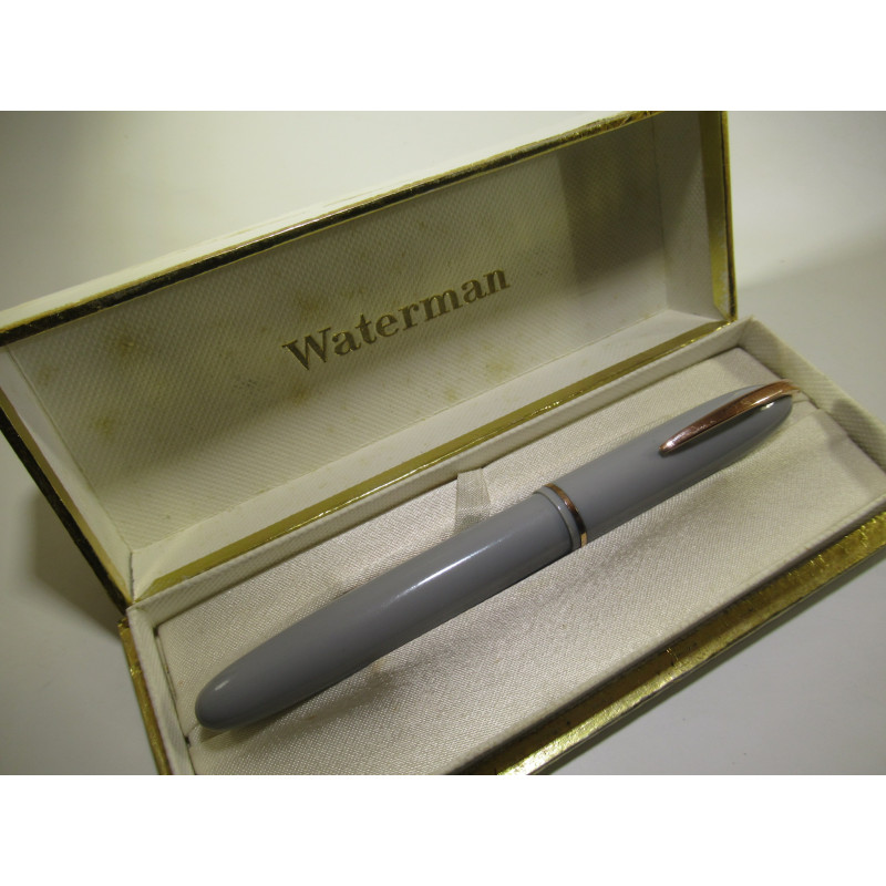 Stylo plume WATERMAN, modèle STANDARD lady à levier. Le sac est absent, plume or « WATERNAN’S – 18 Cts – 2 », en résine couleur gris, marquage sur le clip « WATERMAN’S », marquage sur le corps « WATERMAN’S – MADE IN France », semble n'avoir jamais été utilisé, très bon état général. Longueur avec le capuchon : 121mm, diamètre du capuchon : 12.5mm. Livré dans son étui d’origine. Pour collection ou pour écrire. Si vous souhaitez l'utiliser je peux remettre un nouveau sac et le tester.