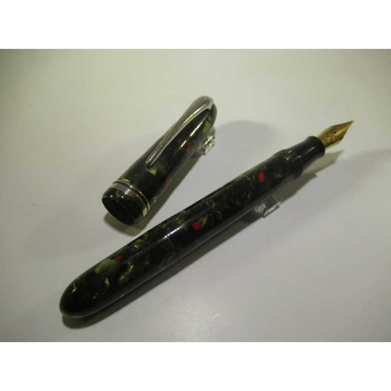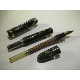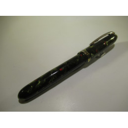 Stylo plume STYLOMINE 303, fabrication française, couleur noir rouge et vert, plume plaquée or « STYLOMINE – XOX - IRIDINOX – 5 », bon état général, système de remplissage à piston, sac présent et fonctionnel, marquage sur le corps presque effacé « STYLOMINE 303 MADE IN France ». Pour collection. Non testé donc aucune garantie pour utilisation. Si vous souhaitez l’utiliser demandez-moi de le mettre en service.