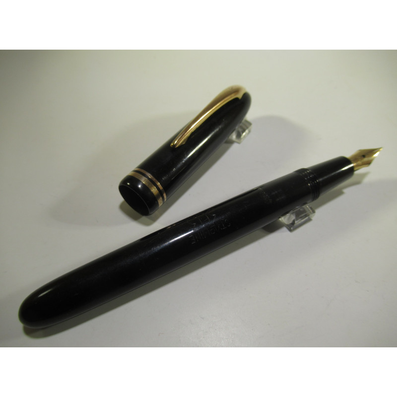 Stylo plume STYLOMINE 303, fabrication française, couleur noire, plume or « STYLOMINE – 18 Cts », bon état général, système de remplissage à piston, sac présent et fonctionnel, marquage sur le corps « STYLOMINE 303 MADE IN France ». Pour collection. Si vous souhaitez l’utiliser demandez-moi de le mettre en service.