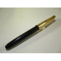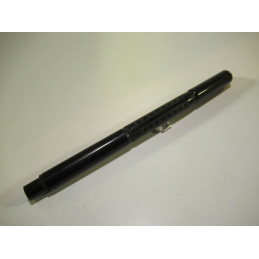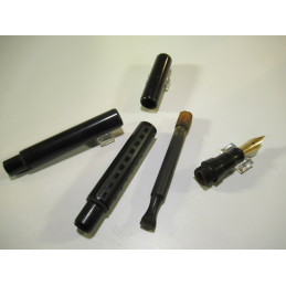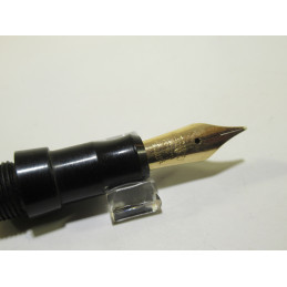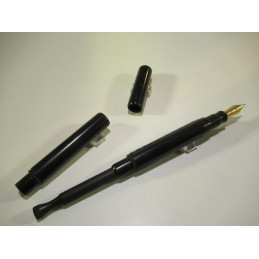 French fountain pen, in black hard rubber, gold nib “WARRANTED – 18 CT – 1st QUALITY”, “syringe” type filling system, the cork piston is present, never used, for collection. Untested, no warranty for use.