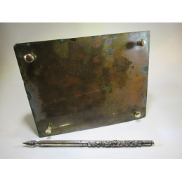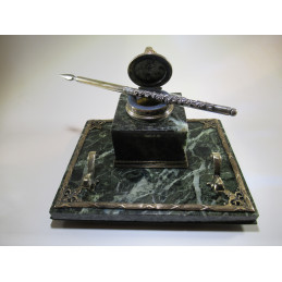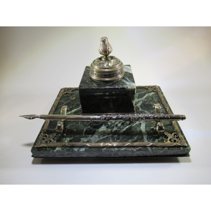 Bronze inkwell on green marble, unknown French manufacture from the 19th century. Comes with a beautiful silver plated pen holder. Good condition.