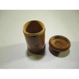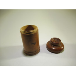 Small French-made boxwood sprinkler. This object was used to dry ink after writing, as a blotting paper would. The lid unscrews to allow it to be filled. Height: 67mm, diameter: 39mm.