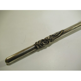 Silver plated pen holder with a flower sculpture in relief. In good condition. Comes with 1 "hand" nib and a small box of matching nibs. For learning to write with a pen holder or for collecting.