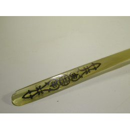Galalith pen holder with a silver inlay . Galalith ("milk stone", from the ancient Greek gála, "milk", and / líthos, "stone") is a thermosetting polymer made from casein and one of the first plastic materials with hard rubber used for the manufacture of writing objects at the beginning of the 20th century. In good condition. Comes with 1 box of assorted feathers. Length without nib 152mm. For learn to write with a nib on a penholder.