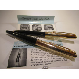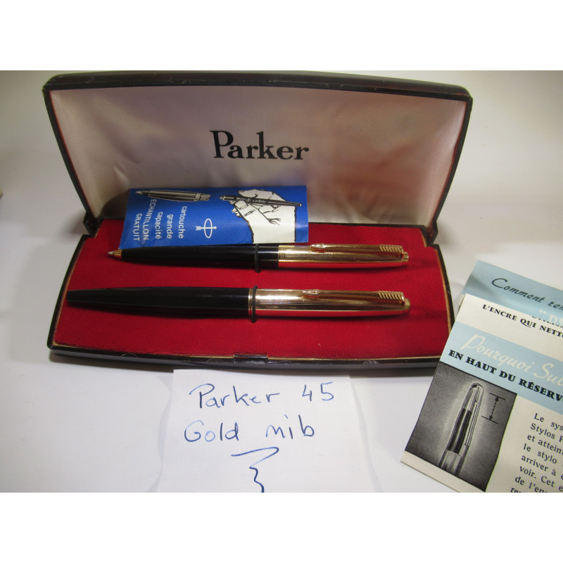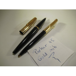 PARKER 45 fountain pen + ballpoint pen set, 18K gold nib, cartridge filling system provided which works, the ballpoint pen cartridge is new, little or not used, excellent general condition. Marking on the base of the cap "DOUBLE OR LAMINE - MADE IN FRANCE - PARKER". In its original case with instructions. For collection or for writing.